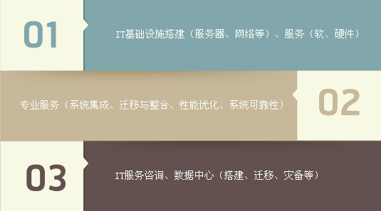 ERP实施与咨询服务(ERP实施、ERP推广、运维、IT规划、升级及技术服务、ERP系统客户化定制开发、培训)、应用开 发和维护(行业应用软件)等。